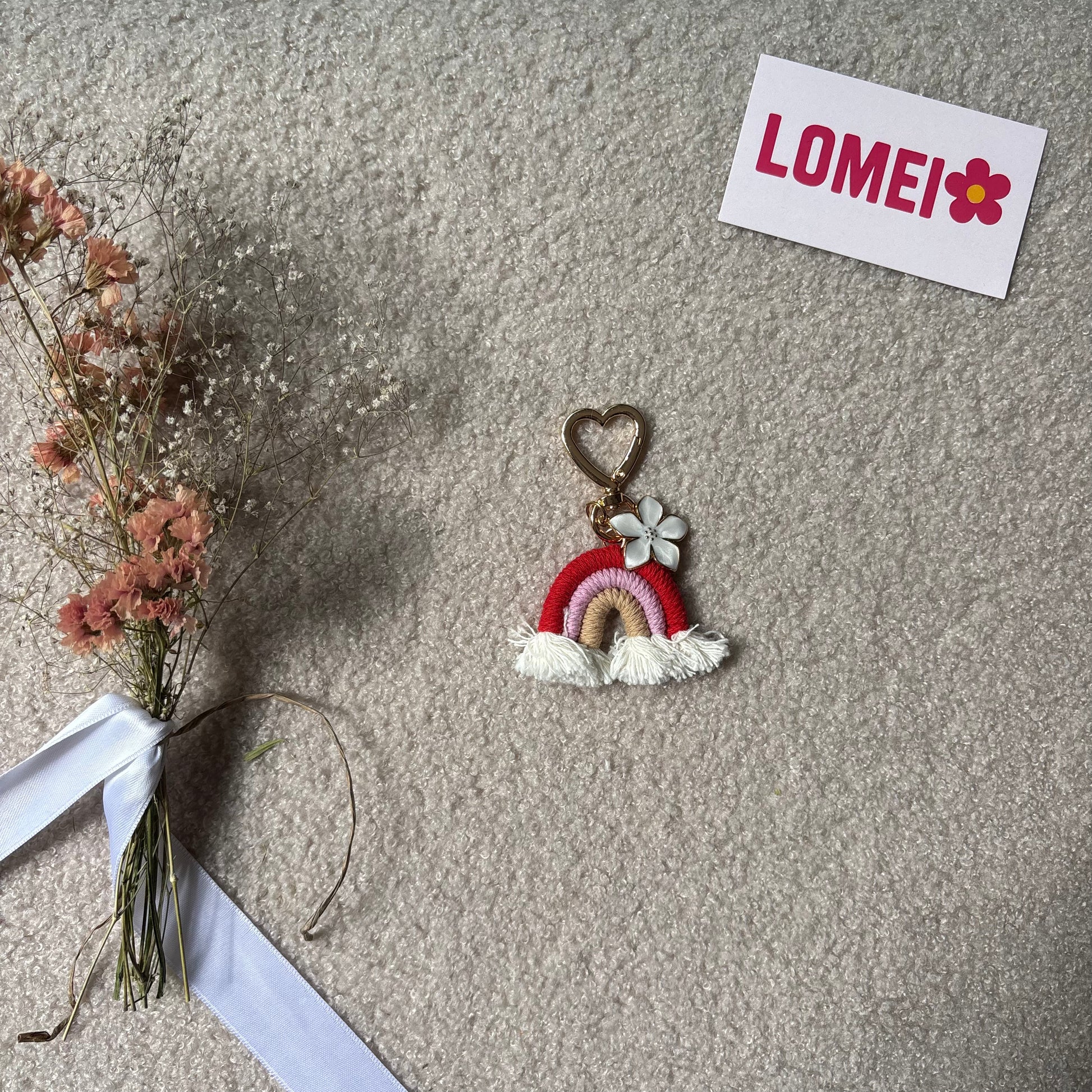 Arc en ciel rouge rose et marron avec fleur blanche, bouclerie or