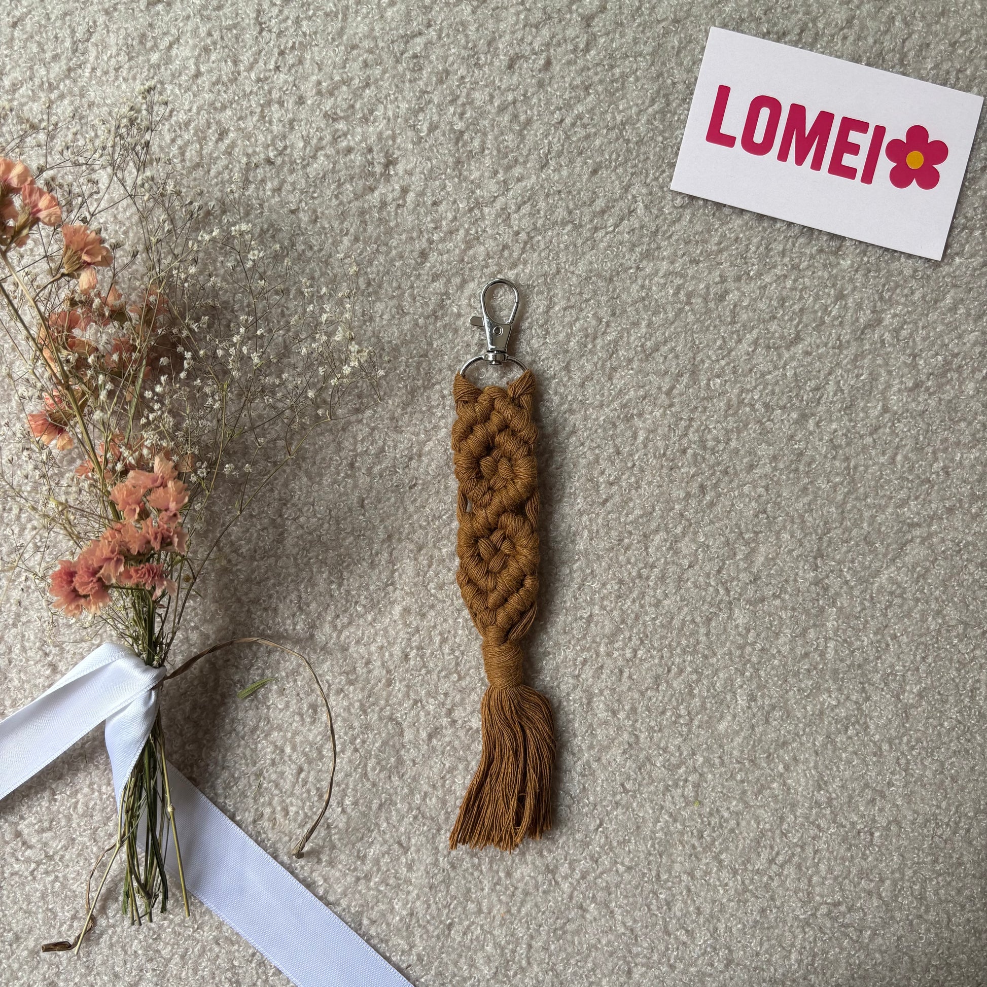 Breloque tressée marron avec ponpon, bouclerie argentée