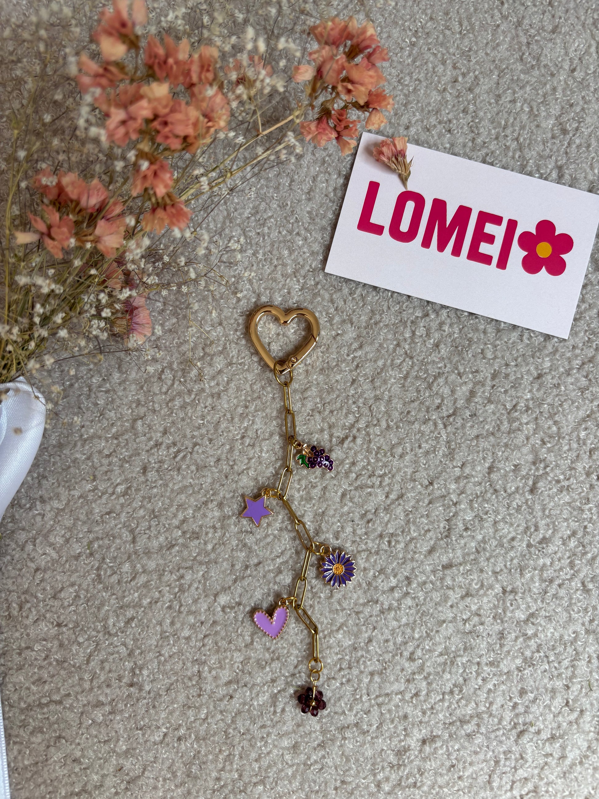 Chaîne charms violette avec 5 charms et un anneau coeur doré