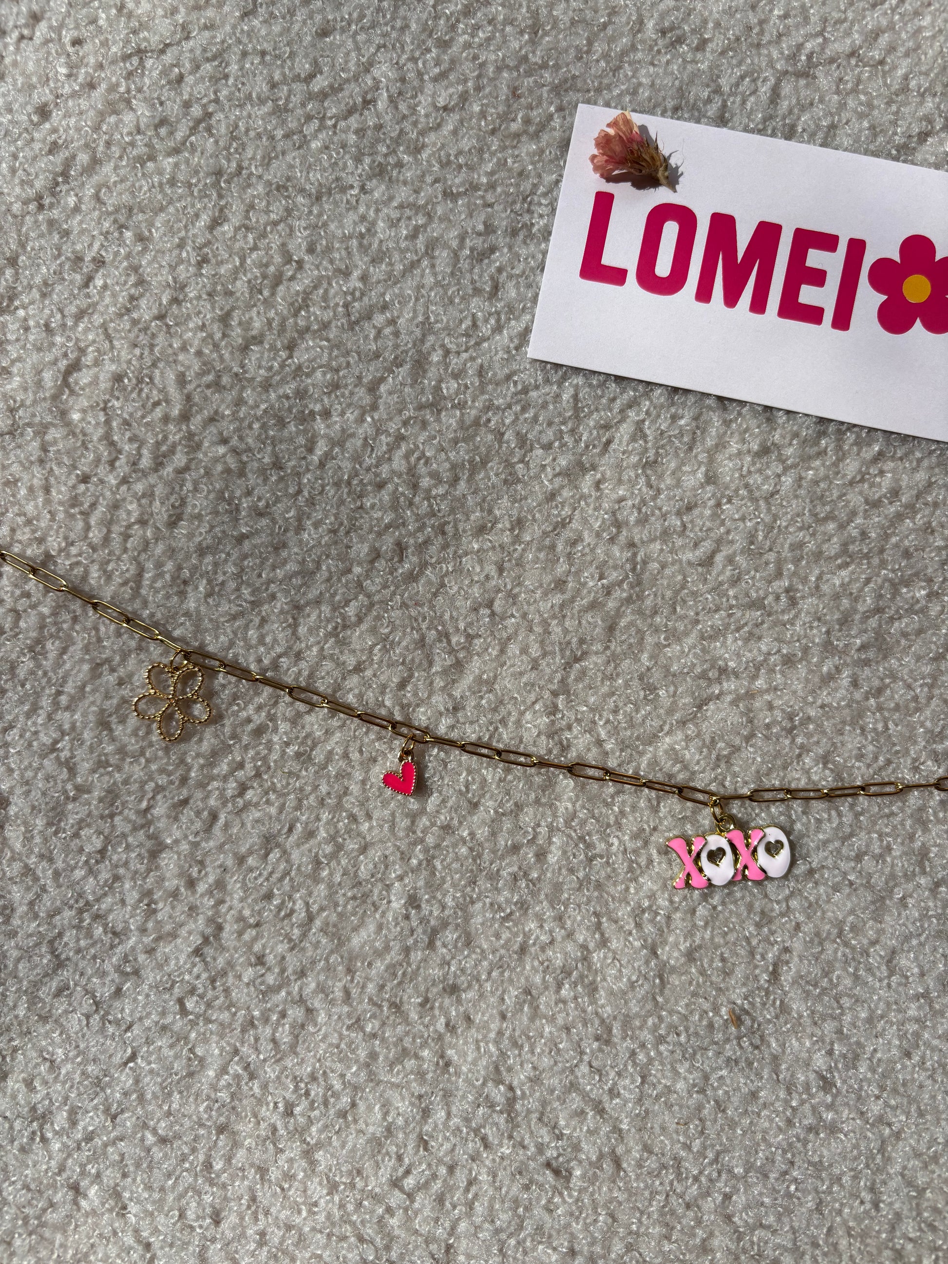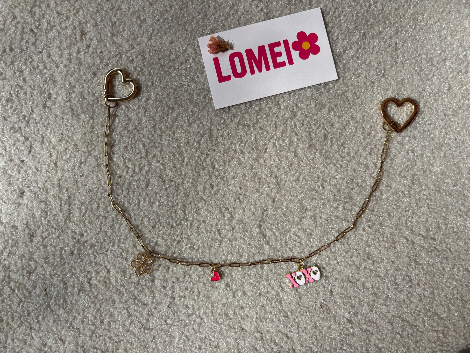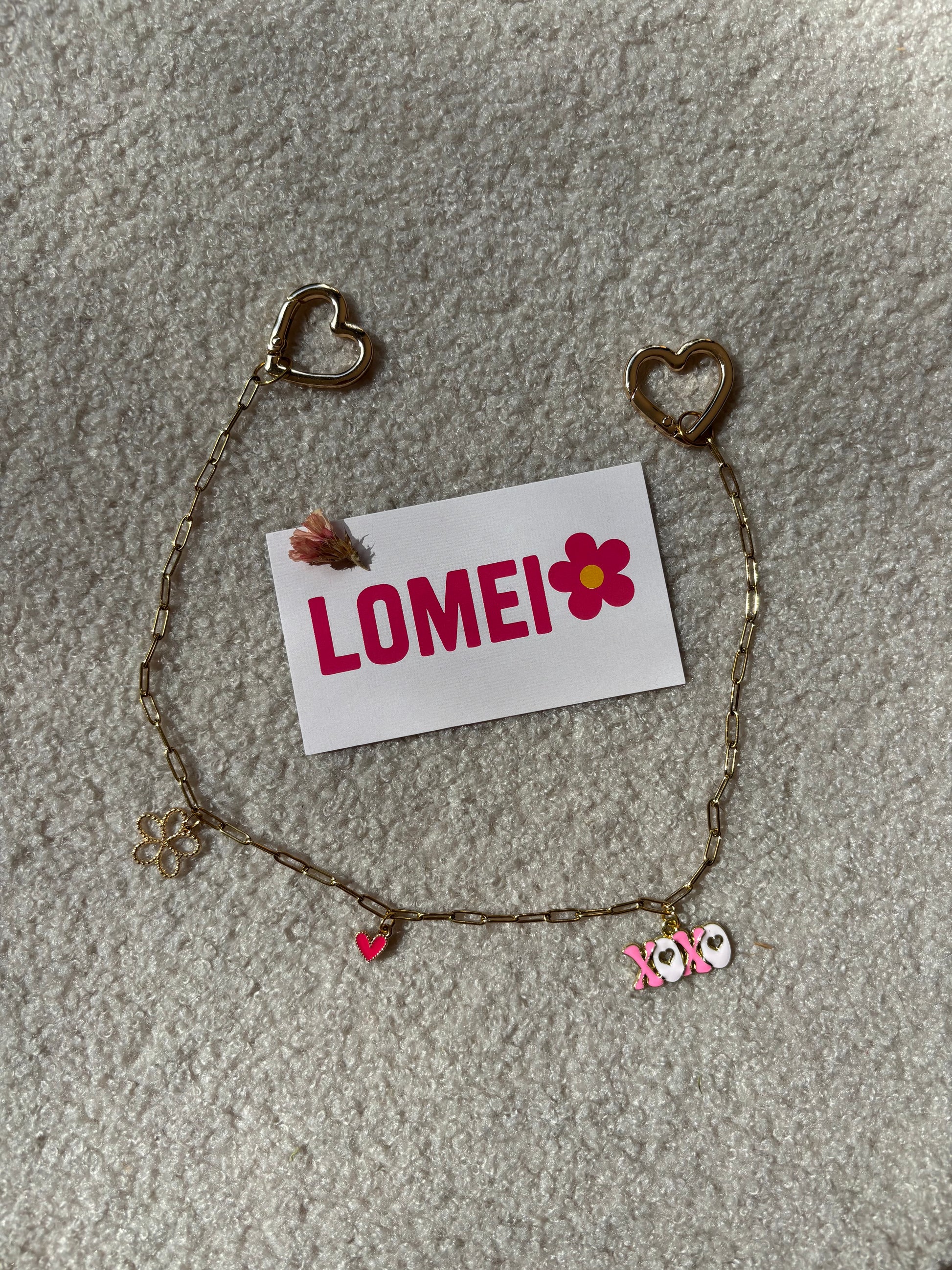 Chaînette de sac LOMEI composée de trois charms et de deux anneaux coeurs dorés