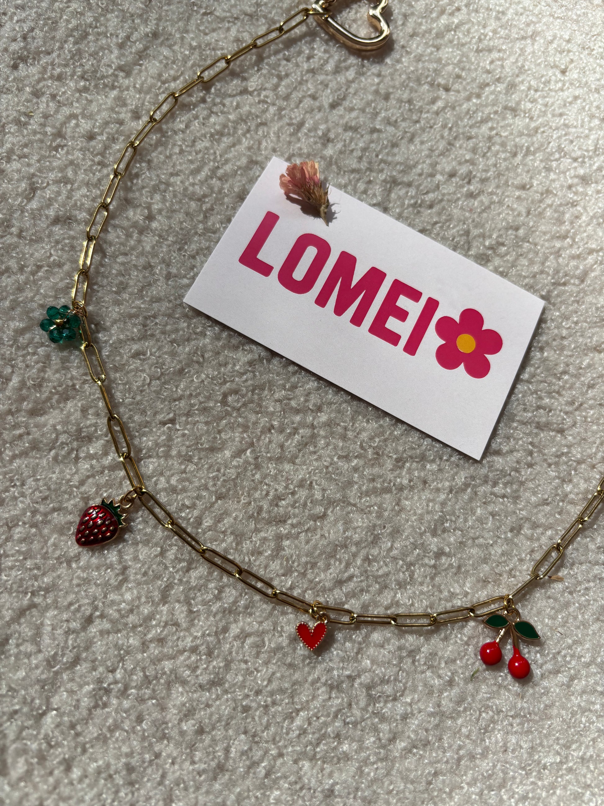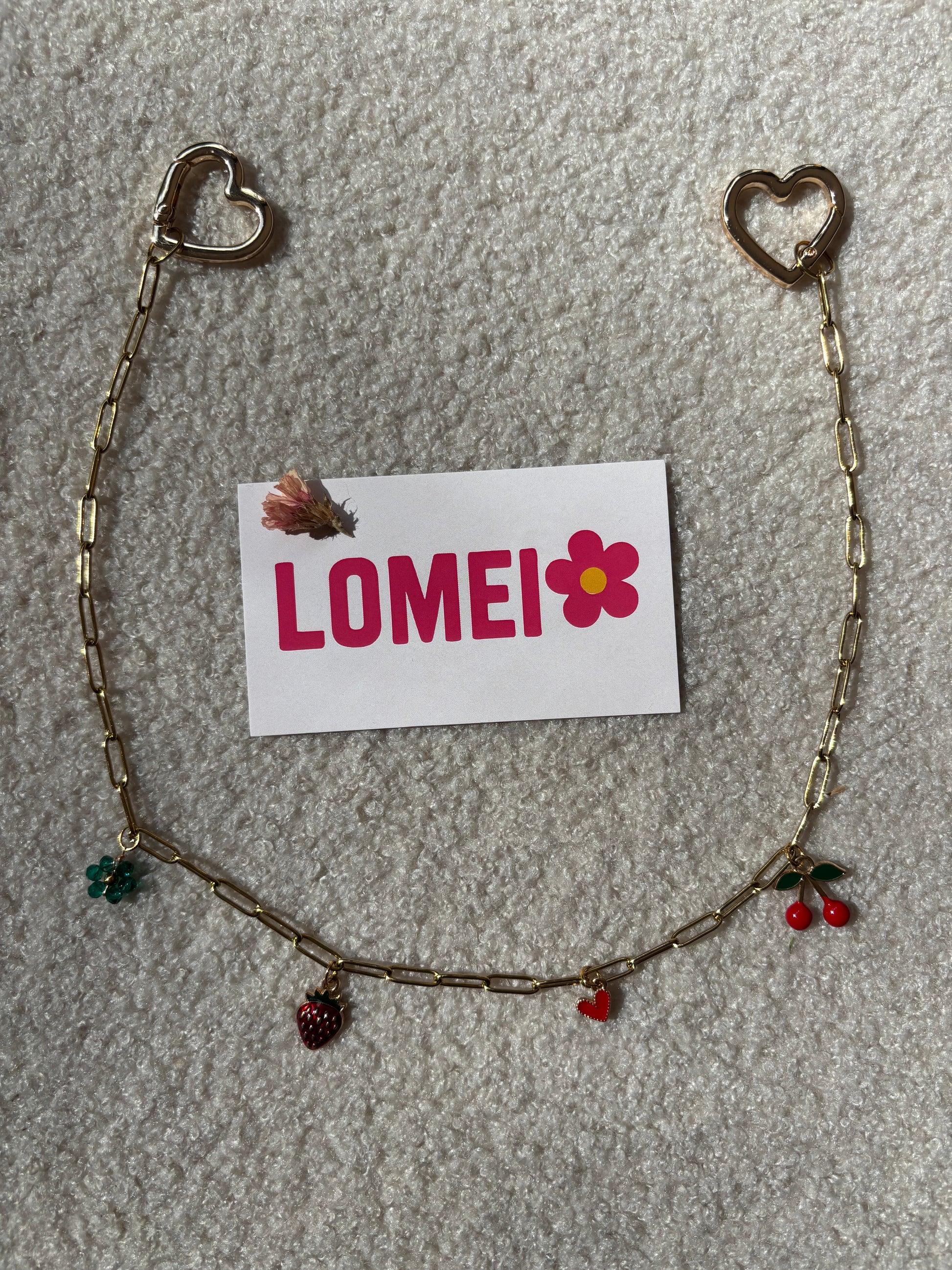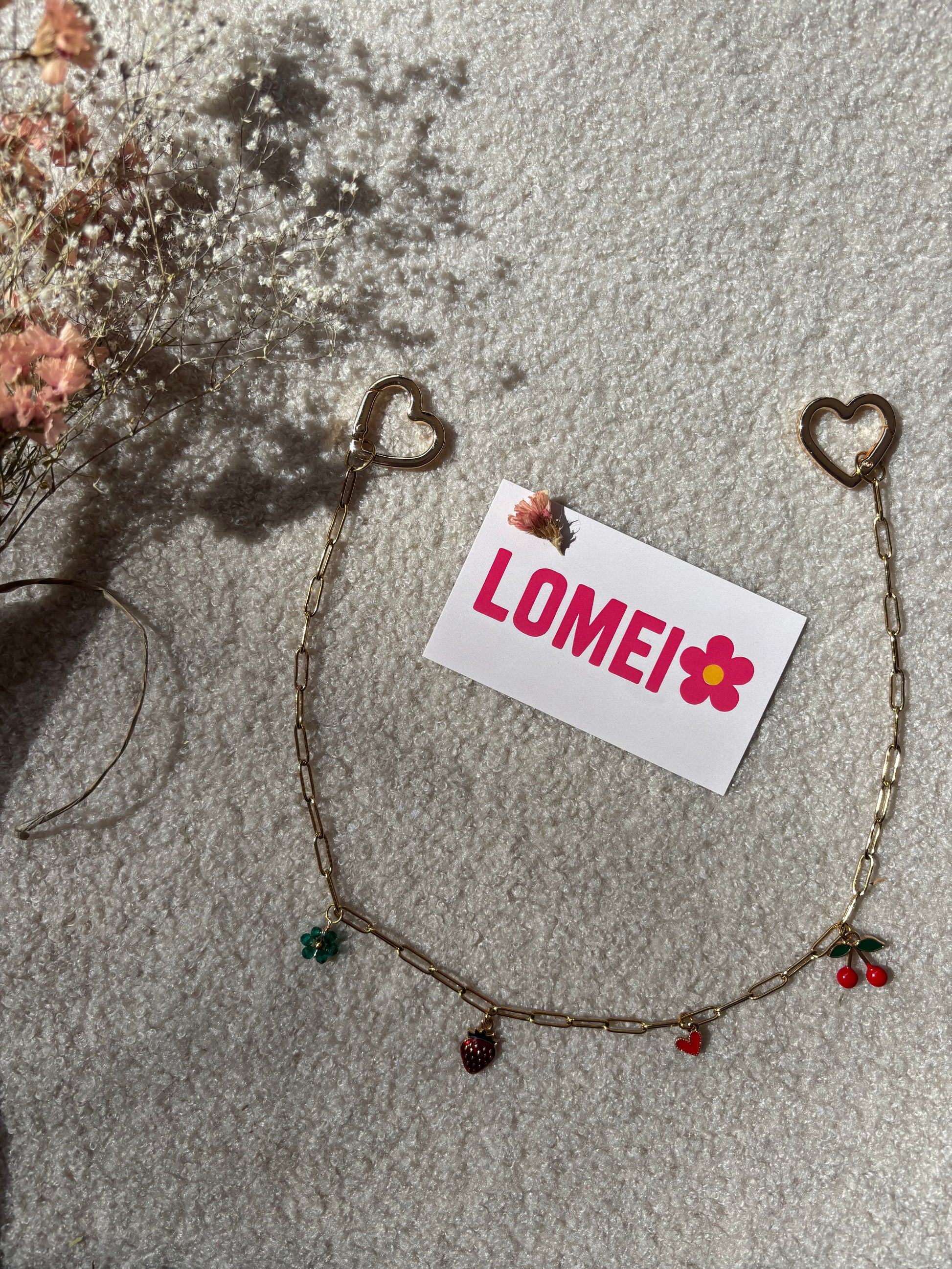 Chaînette de sac Rouge Chérie composée de quatre charms et de deux anneaux coeurs dorés