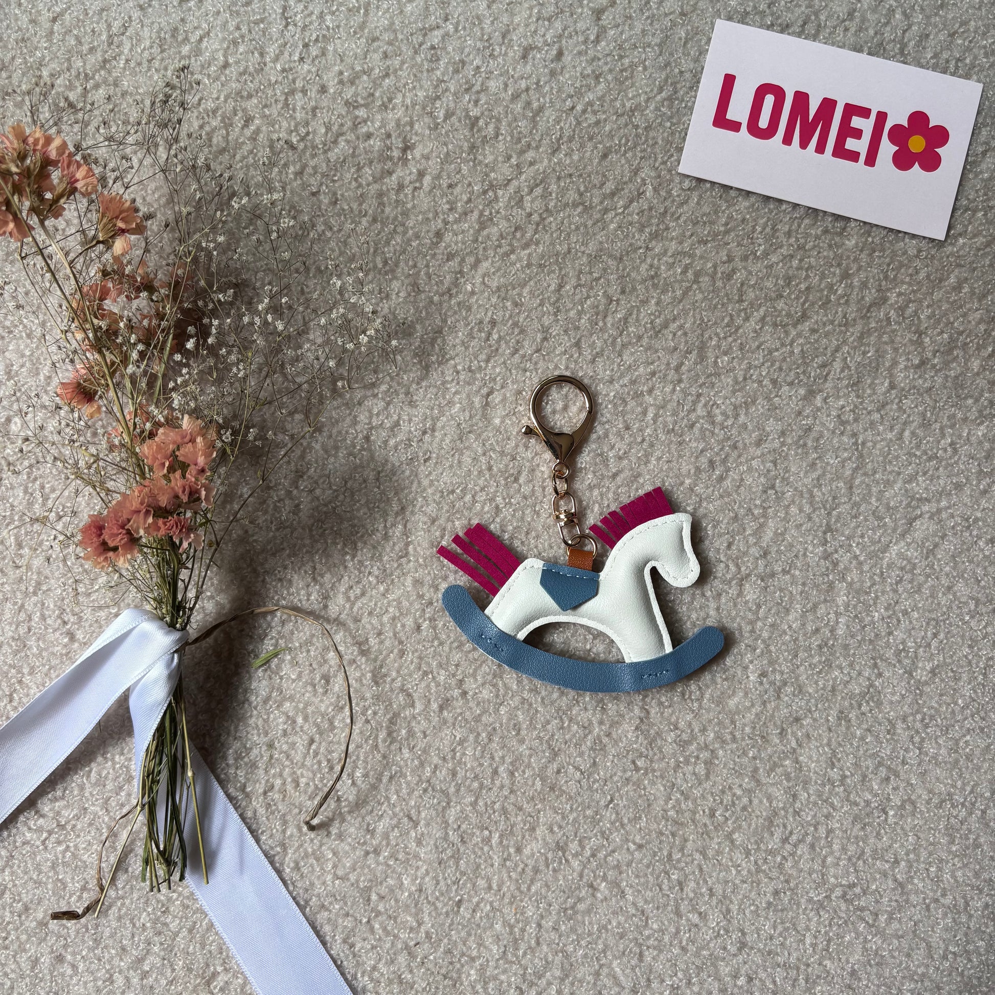 Cheval à bascule blanc, rose et bleu avec bouclerie dorée