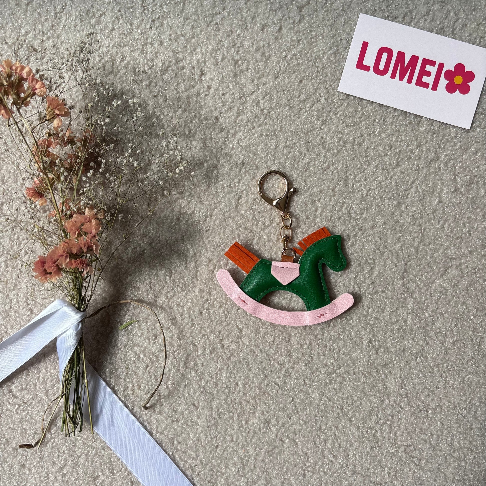 Cheval à bascule vert, orange et rose avec bouclerie dorée