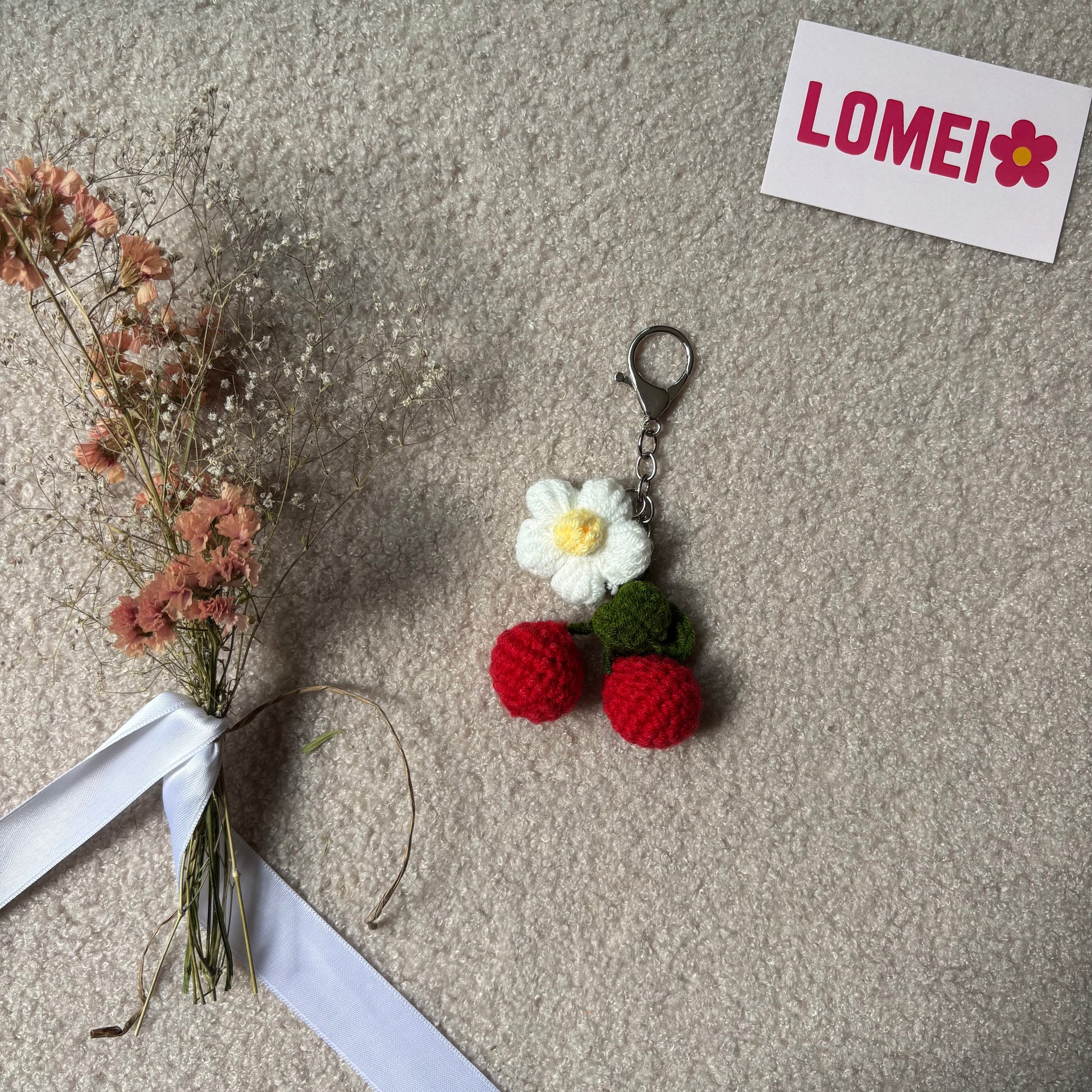 Cerise en crochet avec fleur blanche, bouclerie argent