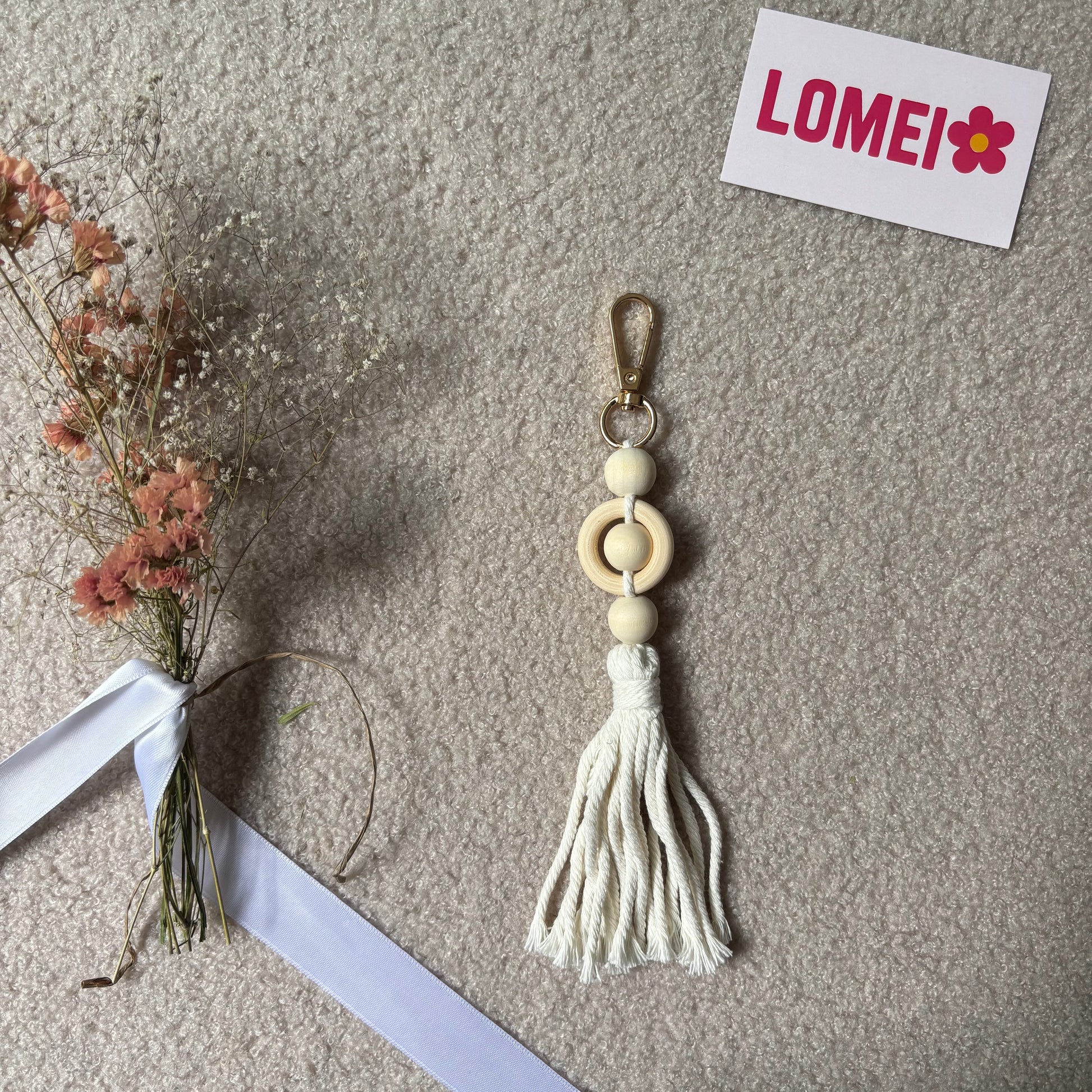 Pendentif blanc avec perles en bois et ponpon, bouclerie or
